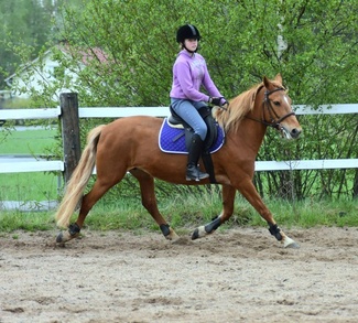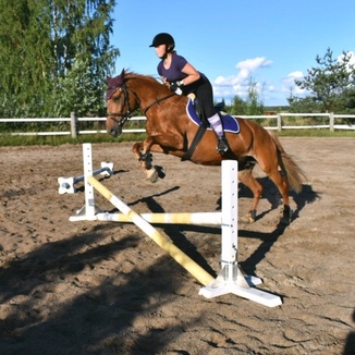 Nykyään mennään koulua ja harjoitellaan rauhallisesti laukkaamista ja välillä mennään jotain ihan pieniä esteitä ja puomeja mielen virkistämiseksi.